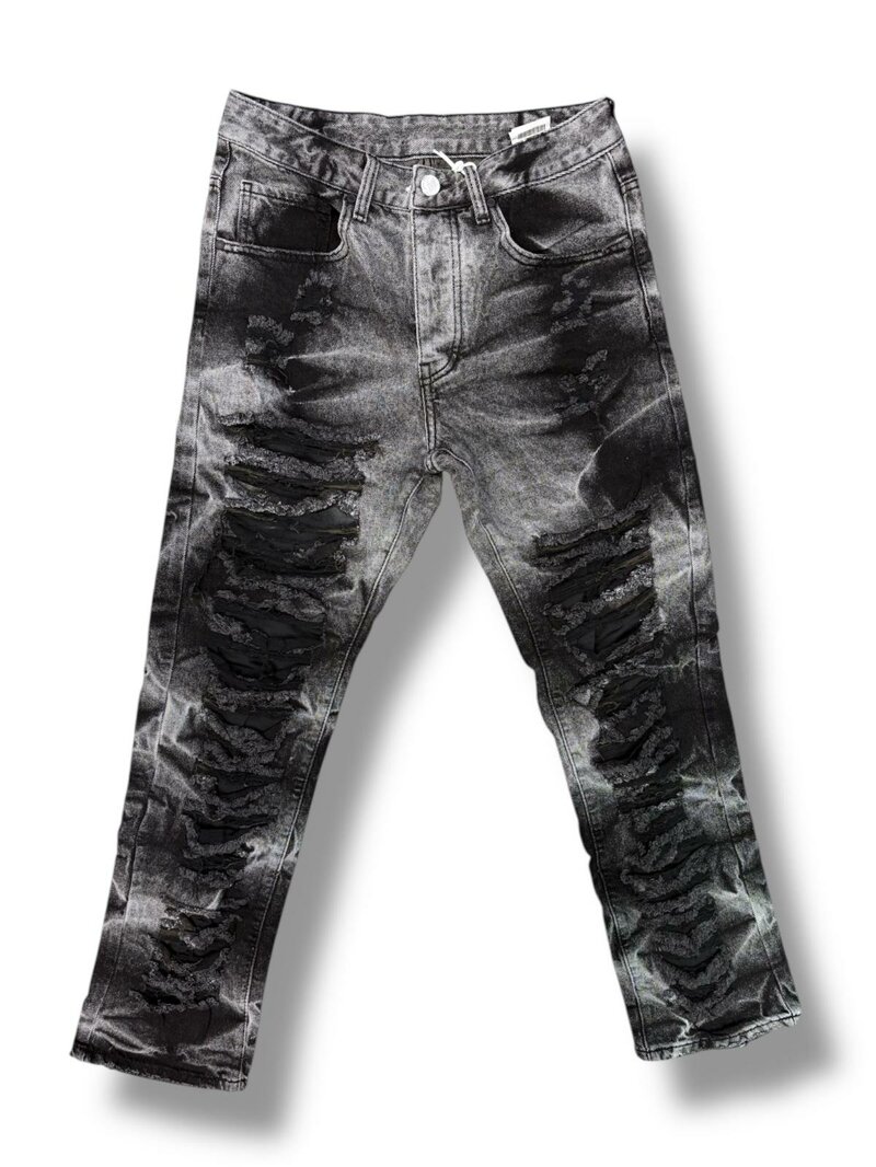 Il denim nero slavato, con effetto "static" sfumato, viene valorizzato da profonde abrasioni verticali su tutta la lunghezza della gamba, impreziosite da tessuto nero a contrasto e finiture sfilacciate. Un design ruvido, potente e urbano, pensato per chi non teme di distinguersi.
